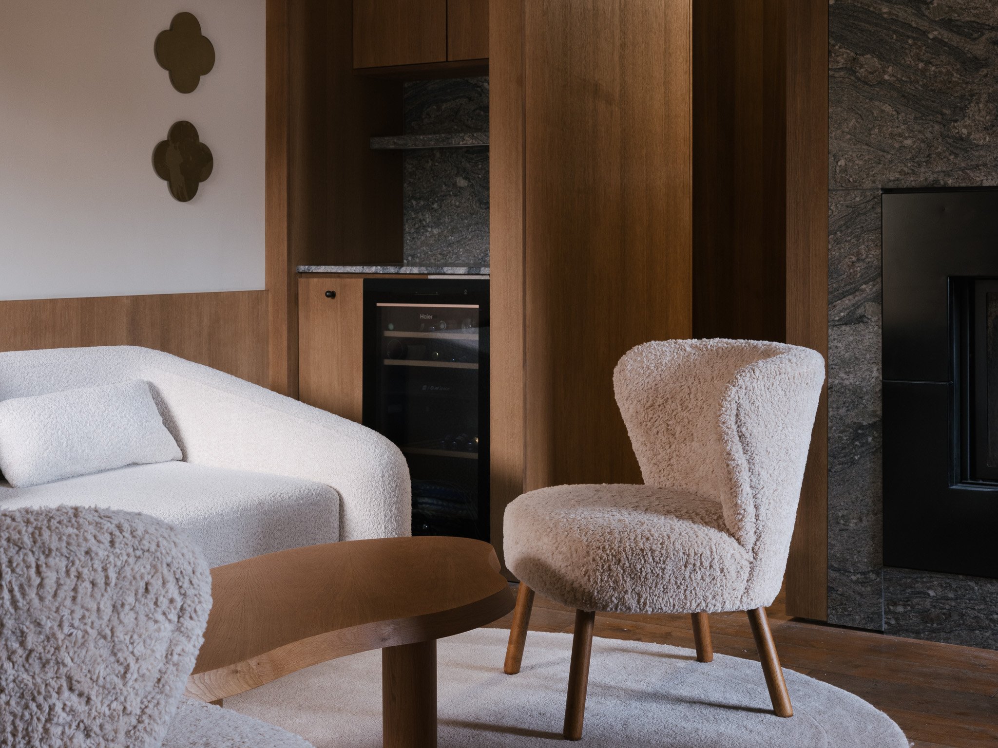 The interior combines a French mountain aesthetic with the freshness of a New Zealand perspective. In the small space, a minimal palette of off-white plastered walls, smoked oak panelling and leather-finish granite flows throughout, tying the elements together. Selected New Zealand art pieces hang proudly on the walls, including three of artist Max Gimblett’s brass quatrefoils - part of the 7,000 that made up the original artwork ‘Remembrance’ dedicated to New Zealand soldiers who lost their lives, many in Europe, in World War One.